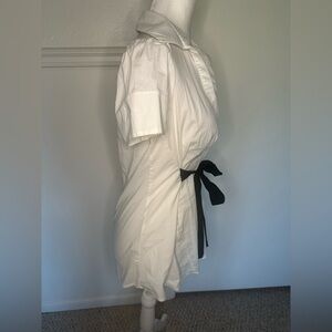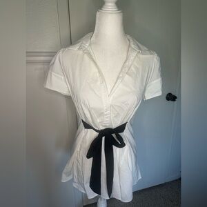 Excellent condition elegant white blouse from BCBGMaxAzria features a notched collar and a fitted silhouette accentuated by a stylish black tie front. It’s a versatile choice for both casual and formal settings.