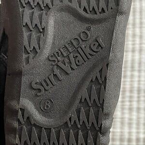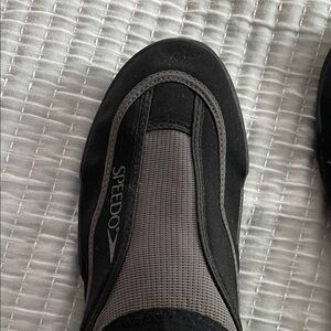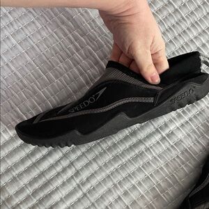 Durable black shoes by Speedo. Ideal for water activities. Size 8 women’s. Black with gray details. Easy pull on Stan.