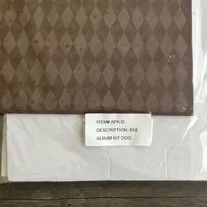 * Kit features a polka dot hard cover album with brown diamond and paw print accents, clear window for photo display, and plastic sleeve insert pages.