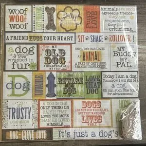 * Multiple sheets of punch-out dog-themed quotes and labels are included, such as "woof woof," "dog-gone cute," "paw prints," and more.