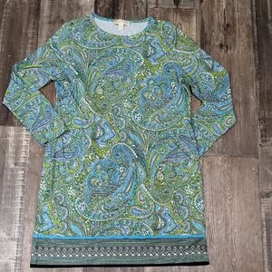 Elegant long sleeve dress with vibrant paisley pattern. Features a mix of green and blue hues. Perfect for any occasion.