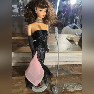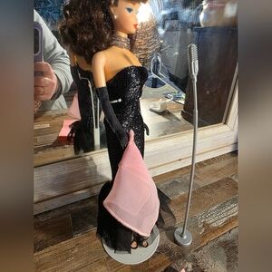 Stunning black sequin gown with a pink scarf. Perfect for a glamorous evening.