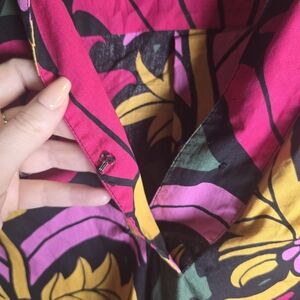 Elevate your style with this vibrant J. Crew floral V-neck blouse. Featuring bold pink, yellow, and green hues, it's perfect for any occasion. In great condition. No rips or stains. The sleeves fit me like quarter length, but I also have really long arms.