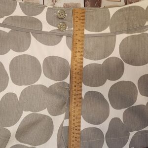 Like new NY&Co shorts in a cream and gray circle/mod print. These have a tailored, structured fit with a linen-like woven feel (no stretch), making them super easy to dress up or wear casual.