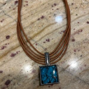 Elegant turquoise pendant necklace featuring a striking brown cord. Perfect for adding a pop of color to any outfit.