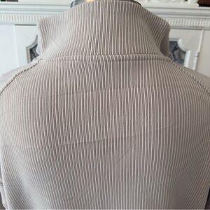 Ottoman Rib Half Zip Pullover, also known as the Rhea Half Zip Sweat. It is made of a wide-knit rib fabric, often a blend of cotton, polyester, and elastane, and is designed with an oversized fit, dropped shoulders, and a high collar. ®