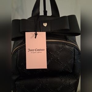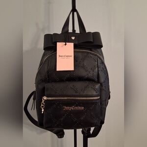 Beautiful, new Juicy embossed black backpack with a distinctive bow and heart accent at the top. Two zippers. Pocket zipper has a bow charm with rhinestones. Adjustable straps. Gold hardware. Measurements are in the photos. Reasonable offers are encouraged! Brand New With Tags!