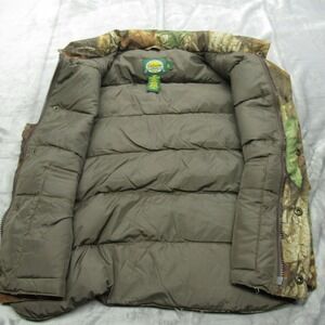 A Cabelas For Kids insulated puffer vest in a realistic camouflage pattern. This vest offers warmth and freedom of movement with its sleeveless design and down filling. Two flap pockets on the front provide convenient storage. Perfect for outdoor adventures, hunting trips, or casual wear on cooler days.