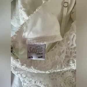 Chic white lace dress with a high low hem. Features delicate lace and a flowing silhouette. Perfect for special occasions.