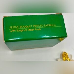 Delicate floral design with shimmering white petals and tiny pearl centers. Gold accents with sparkles add elegance. Stainless Steel post with stamped designer backs. Beautiful to wear for every season. Original Avon box included dated 1990. These lovely floral earrings are in excellent condition.