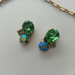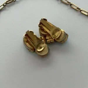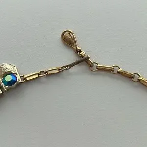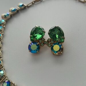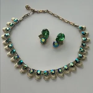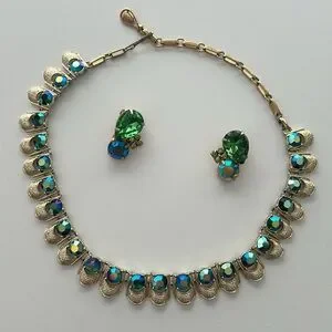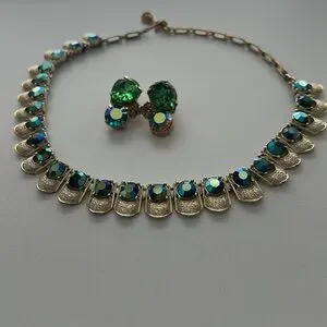 This exquisite jewelry set features a stunning gold toned necklace adorned with vibrant green and blue AB stones. Perfect for adding a touch of elegance to any outfit. It’s 1950s vintage, signed Coro on the clasp. The earrings are clip on. One of the big stones is missing some of its finish around the edges (shown) otherwise great condition!