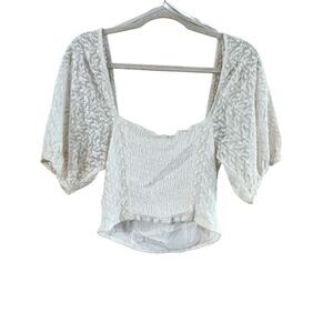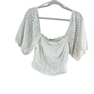 This elegant crop top features short, puffed sleeves and a charming neckline in a pristine white hue. The lightweight fabric offers a comfortable fit, while the delicate decorative elements along the neckline and sleeves add a touch of femininity.