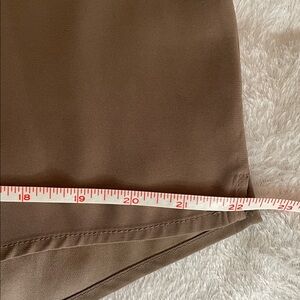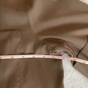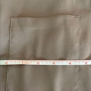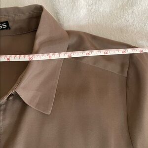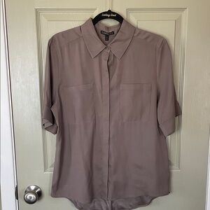 EUC Lovely vintage taupe or mushroom colored polyester blouse that feels like silk with 2 patch pockets and 5 hidden buttons.