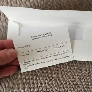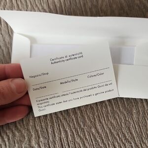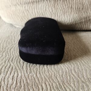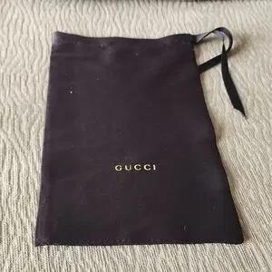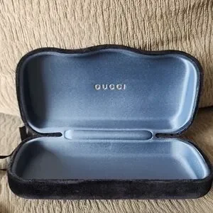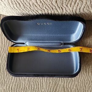 Luxurious Gucci eyewear case. Includes black pouch. Elegant design with grey lining. Certificate of Authenticity included. Measurements pictured.