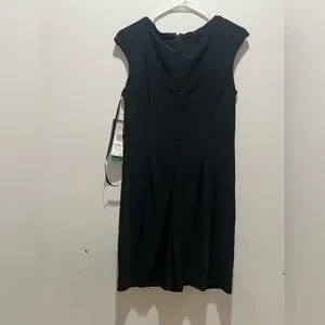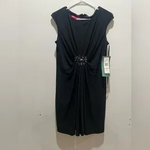 Elegant Nine & Co black sheath dress, new with tags, featuring a flattering ruched waist accented with a beautiful beaded embellishment. Designed with cap sleeves and a tailored silhouette, this dress offers a timeless, polished look ideal for cocktail parties, evening events, weddings, or formal occasions.
