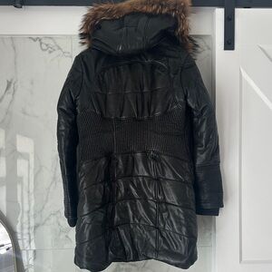 Elegant Black Genuine Leather Coat with Genuine Fur Trim