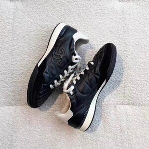 Stylish CHANEL booties with quilted black design. White accents and iconic logo detail.