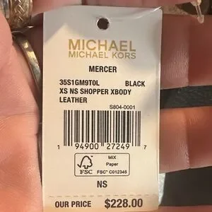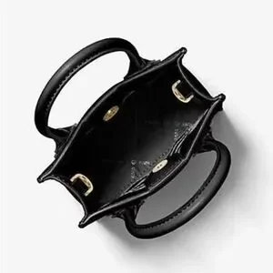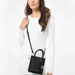 Chic mini bag by Michael Kors. Sleek black design with gold hardware and a gold MK logo charm. Perfect for stylish outings.