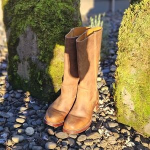 Elegant Frye boots with a sleek tan leather finish. Perfect for versatile styling.