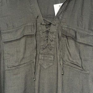 Olive green lace-up utility shirt. Features a V-neck with a detailed lace-up closure, two front chest pockets with button flaps, and long sleeves with button cuffs. The hemline is a flattering high-low cut.