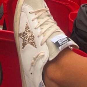 Stylish Golden Goose sneakers. White base with gold star detail. Comfortable and trendy.