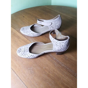 These pre-owned Easy Spirit "CINDIE" wedge sandals, size 11M, feature a beige laser-cut leather upper with a balance of man-made materials. The design includes a closed toe, an open heel, and an adjustable ankle strap with a Velcro closure. The shoes have a comfortable padded insole and a modest wedge heel.