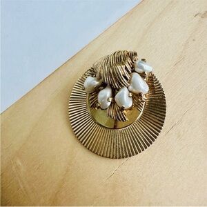 Vintage 1.5” BOUCHER Gold Tone Circular Brooch w Art Deco Style & Faux Pearls