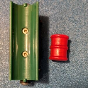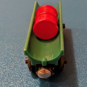 Green wooden barrel car and red barrel from Thomas and Friends Wooden Railway. Also maybe a log car? Not 100% sure this is the right barrel but it fits perfectly.