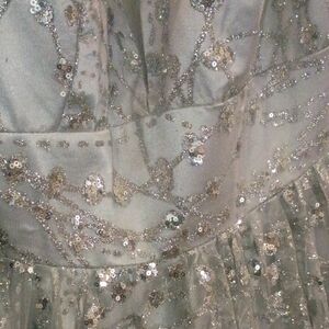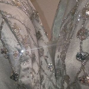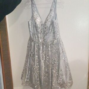 Stunning silver sequin dress with a V-neckline. Perfect for special occasions.