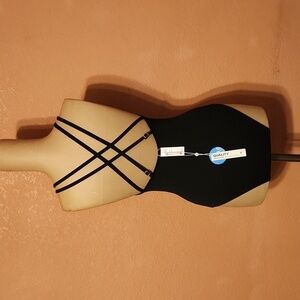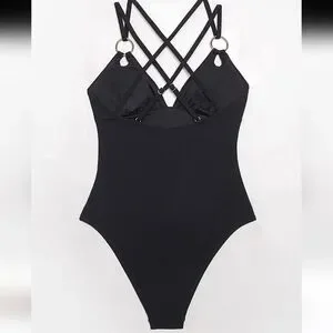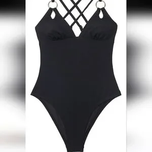 New with tags! Such a sophisticated classic swimsuit. It is solid black with gold rings connecting the straps to the bust. The fabric feels simply luxurious! The top has a nice keyhole detail where the rings connect. It has removable bra pads. The double criss cross straps add even more subtle detail to this swimsuit. This suit is a win whether you're at the beach or the pool! AND it's new with tags! Size small. Feel free to ask any questions!