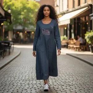 casual long dress, scoop neck dress, cottagecore dress, long sleeve dress, relaxed fit dress, cottage style dress, cotton maxi dress, vintage dress, cottagecore, cottage core, hand-painted, painted dress, linen dress, boho, maxi dress