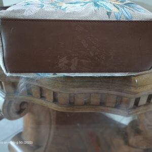 Elegant crossbody bag with floral design. Features adjustable strap. Ideal for casual outings. Measurements: 11.5" x 12". Beautiful tan crossbody with a golden shimmer thread throughout. Has light floral embroidery. colors are white, light blue and light pink. Goldtone zipper. 3 separate compartments. adjustable strap. very clean inside. ** NOTE see the last pic. as the bottom shows some wear and fade to the leather.