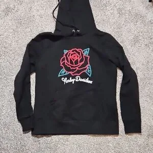 Black hoodie with a bold red rose and Harley-Davidson logo. Stylish and comfortable.