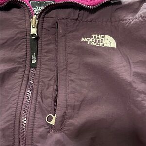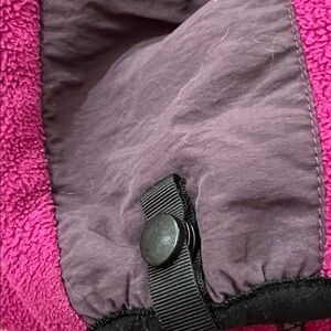 You’re going to need a jacket on those cooler Spring nights and Spring days that are still a littler cooler. When you need something warm but light. . Stylish and warm fleece jacket. Features magenta and purple color blocks. Ideal for outdoor activities. C098. 3 zipper pocket on front. Working adjustable waist tie to keep that cold wind out. North Face thinks of everything, they have snaps on the end of each sleeve for those gloves.