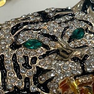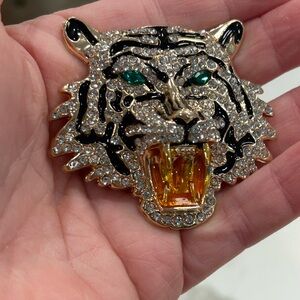 This listing is for a stunning vintage Runway Kenneth Jay Lane tiger brooch adorned with sparkling Austrian crystals. This brooch features vibrant green eyes and a striking orange mouth set in gold with black enamel. There is a loop in the back so the brooch can be worn as a necklace. I have a chain with the brooch, but I am not sure if this is the original chain. The Kenneth Jay Lane stamp is on the interior. This piece comes with its original KJL jewelry pouch and is in excellent/like new condition!