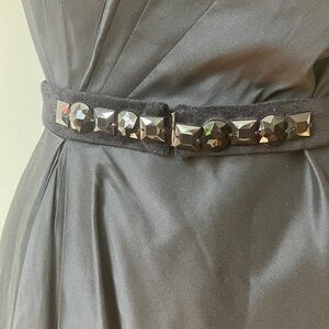 Byron Lars beauty mark black sateen ruched below the knee cocktail party dress size 8 in very good condition. Asymmetrical back neckline, belted waist and ruched pleated bodice and skirt- a beautiful dress- party