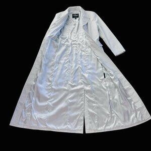 Beautiful genuine leather outer with a satin-feel lining and classic 1990s trench styling. This coat is brand new without tags and has never been worn. Clean, sleek, and dramatic — a standout white leather statement piece.