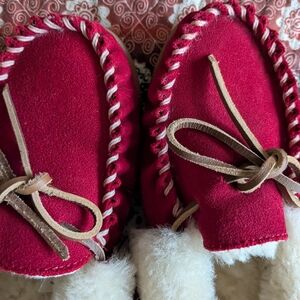 Cozy red warm slippers for winter. Marked size 7 but runs small due to the amazing 100% lambswool Sherpa lining! Only worn twice as too small. No damage or stains noted. Pet and smoke free home.