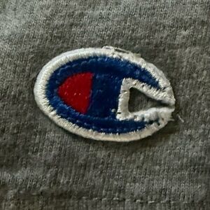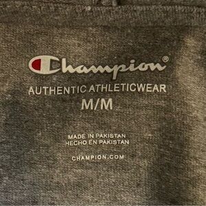 Stylish gray pullover hoodie with iconic blue and red Champion logo in a mens medium. Weight of a t-shirt while providing warmth and comfort of a sweatshirt. Full front pocket. New with tags, smoke free environment.