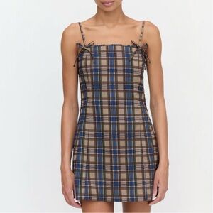 Chic mini dress with plaid pattern. Features blue and brown tones. Spaghetti straps and square neckline. Perfect for casual outings.