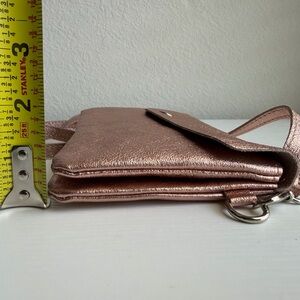 New, never used. Rose gold \ copper metallic genuine leather crossbody bag with 3 pocket compartments (2 open, 1 zipper). Exterior snap closure.