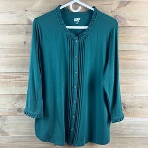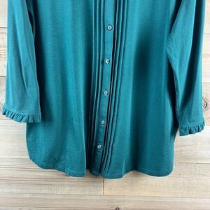 Lands End Womens Shirt 3/4 Sleee Button Up Jersey Ruffle Neck Pintuck Green XL
