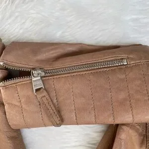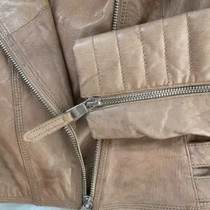 Stylish brown leather jacket. Features zippered pockets and quilted sleeves. Perfect for a chic look. Please ask questions.
