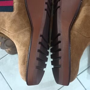 Elegant Nutella brown suede booties by Cecelia NY. Has distinctive red and green striped side panels. Chic style for everyday use. Measurements: 2 1/2" heel. Leather upper and lining. Pull on with elastic inserts. NWB and dust bag.