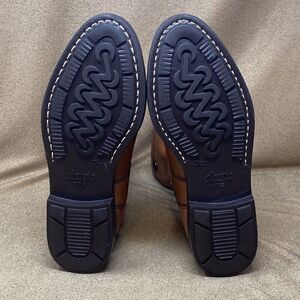 In good preowned condition sweet genuine leather boots in classic tan colour featuring warm faux shearling lining, adjustable buckle and cool fold over top with snaps. Anti slip rubber soles are in excellent condition.