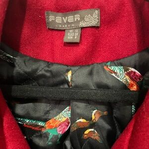 Chic and warm red wool coat by Fever, perfect for cooler seasons. Features a stylish pleated back and unique pheasant/bird print lining for a touch of character.