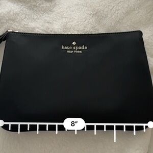 Chic black wristlet by Kate Spade. Features elegant gold accents. Ideal for any event and timeless style! New and never used. Tag comes with bag