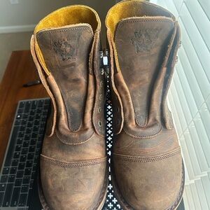 Experience the perfect blend of style and durability with these rugged brown leather boots. Ideal for any adventure. This is a like new pair of Jim Green Numzaan boots. Worn outside of the house one time. They are unfortunately too small for me. Size 11 US in wonderful condition