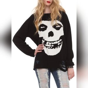 Black knit sweater from the Misfits with intarsia knit Fiend Skull design and destroyed accents.