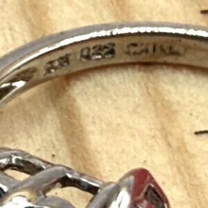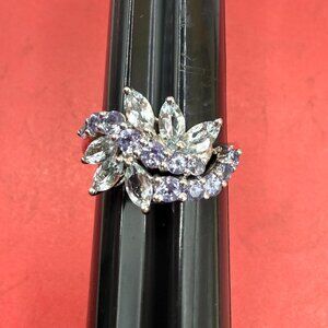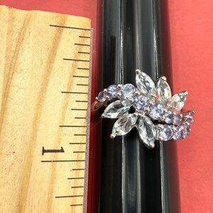 A stunnign cluster ring marked 925 as shown. See photos for all markings. Preloved estate jewelry. Shows minor evidence of age and use. Beautiful sparkling genuine stones. Shown with ruler and sizer falling nearest to size 8. Lovely piece of estate jewelry. Statement, right hand, cluster ring, gem stone, ring, fine, sterling, 925, silver, retro, birthstones, dressy occasion.